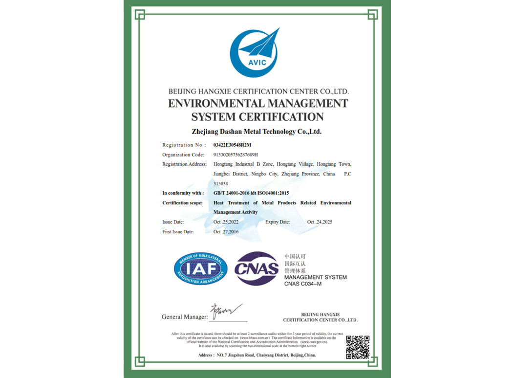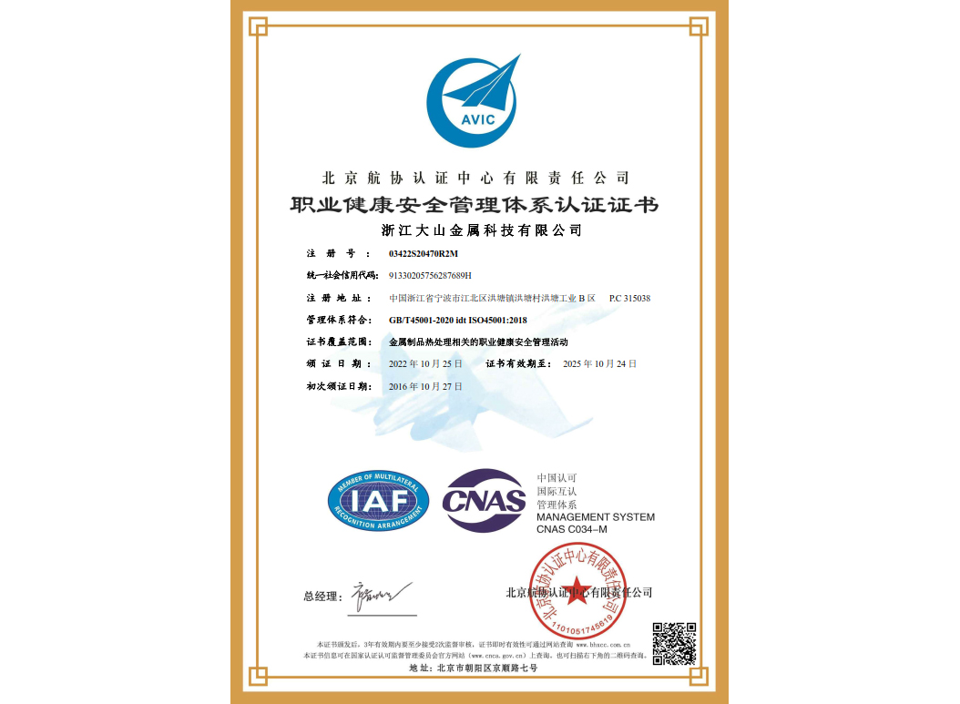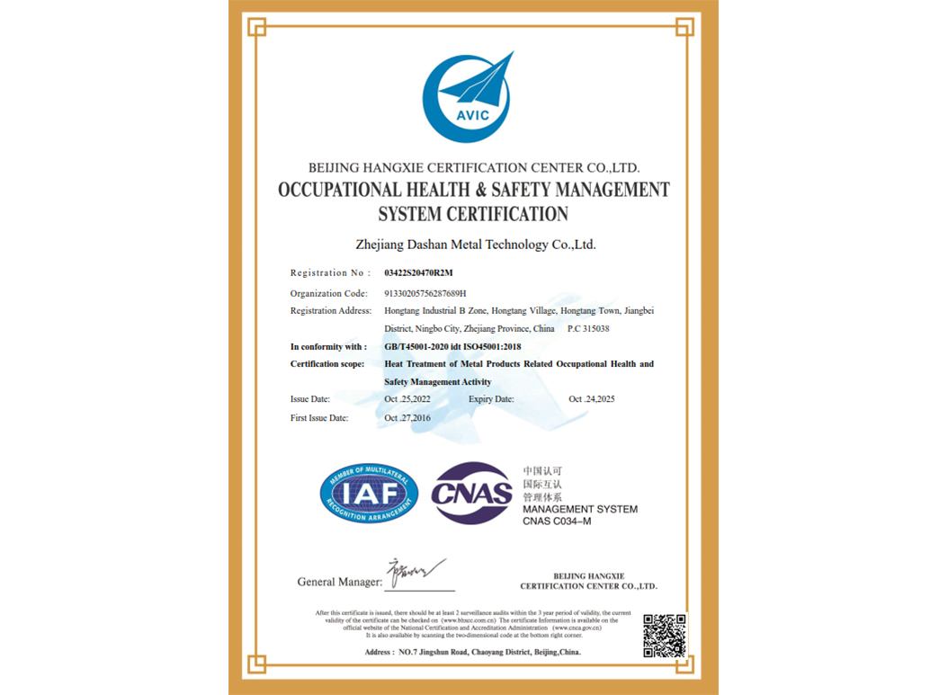 經過近35年來不斷引進先進的熱處理設備和技術,使企業具備了雄厚的產品熱處理工藝開發和生產能力,在熱處理行業中取得了令人矚目的業績,在客戶中建立了良好的口碑。本企業已通過IATF 16949:2016 質量管理體系、GB/T24001-2016 idt ISO14001:2015 環境管理體系、ISO 45001:2018 職業健康安全管理體系認證,正全面貫徹執行相關管理體系標準,為客戶提供更有保證的全面服務。大山愿與各界朋友攜手共進,為提高熱處理質量不斷努力!